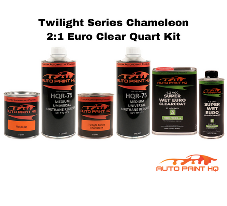 The Base Color mixes 1:1 with the reducer making 2 Quarts of sprayable Base. The Chameleon Pearl Color mixes 1:1 with the reducer making 2 Quarts of sprayable Chameleon. The 4:1 mix ratio Super Wet Show Clear Kit makes 1-1/4 quarts of sprayable Clear. The 2:1 mix ratio Super Wet Euro Clear Kit makes 1-1/2 quarts of sprayable Clear.